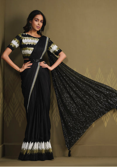 Design and style and trend will be at the peak of your attractiveness when you dresses this pre-stitched-ready to wear sequins work crepe silk saree with sequins belt.