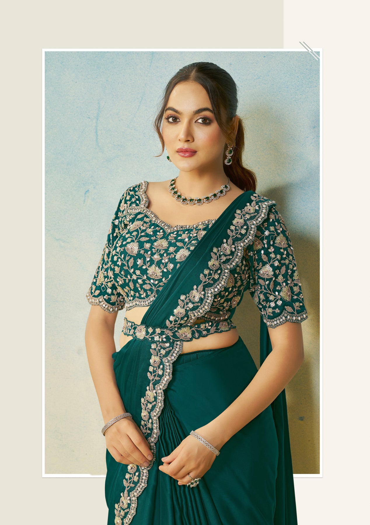 Crafted from luxurious satin silk, this pre-draped saree offers refined comfort without compromising on sophistication. Featuring an ornamental belt and coordinated blouse, it's engineered for effortless elegance at weddings, festivals, celebrations, and formal gatherings.
