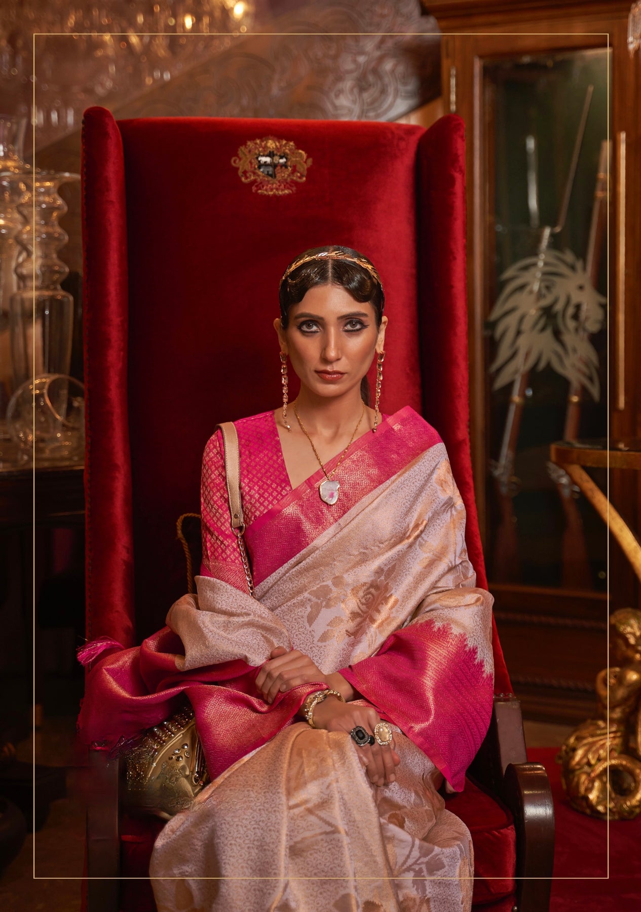Presenting a luxurious Kanchipuram silk saree, exquisitely crafted with beautiful zari patterns, intricate motifs, and a broad border. The soft silk fabric provides a unique and grand traditional look, enhancing your look to the highest level. The saree is embellished with silver and gold zari weaved motifs and a broad border, adding exquisite finishing touches. Perfect for weddings and pre-wedding functions, this soft and smooth fabric saree is a must-have!
