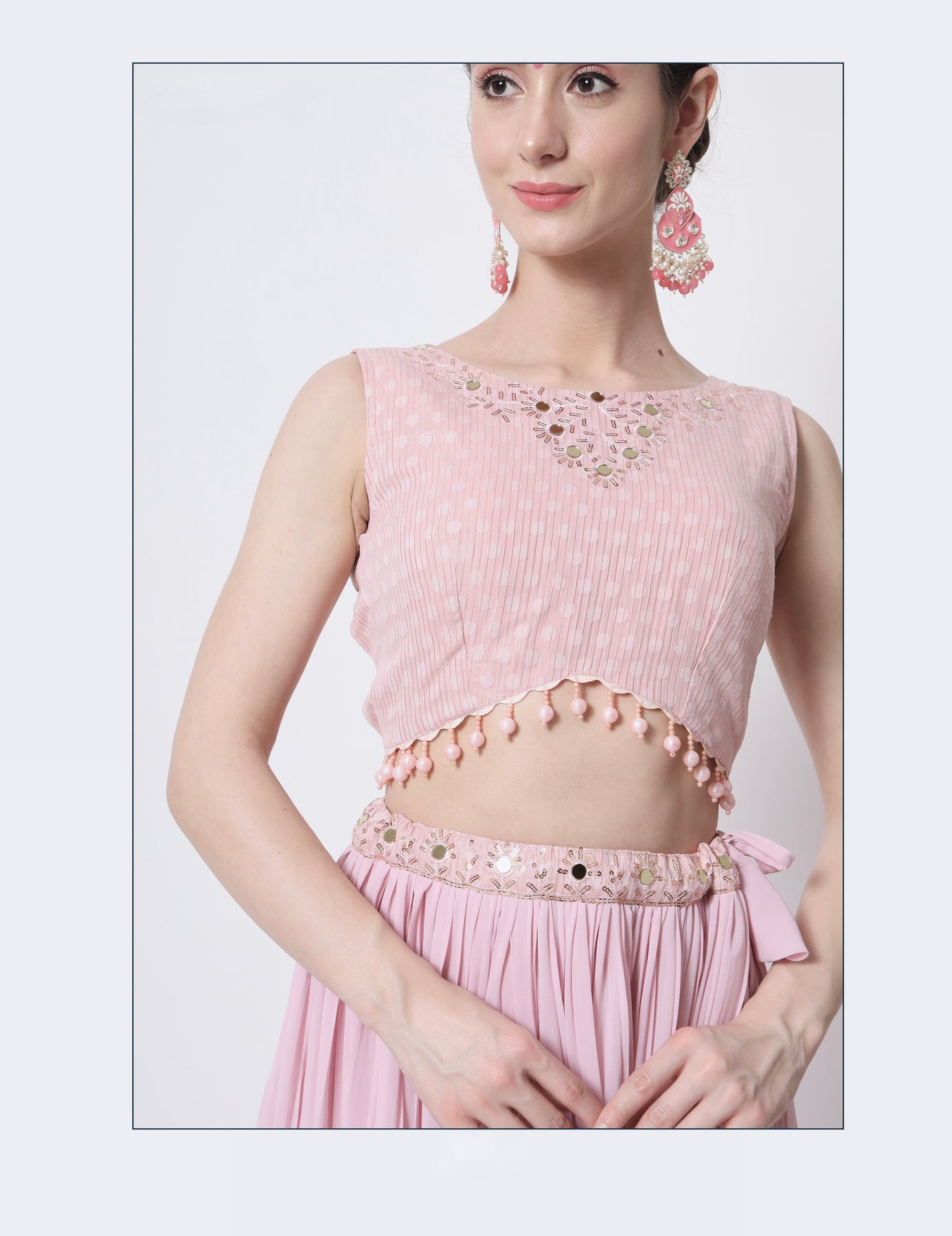Bright and colourful, this pale pink georgette lehenga comprises a delightful traditional look. This round neck and sleeveless blouse were designed using resham thread, printed, mirror, lace, and sequins work.